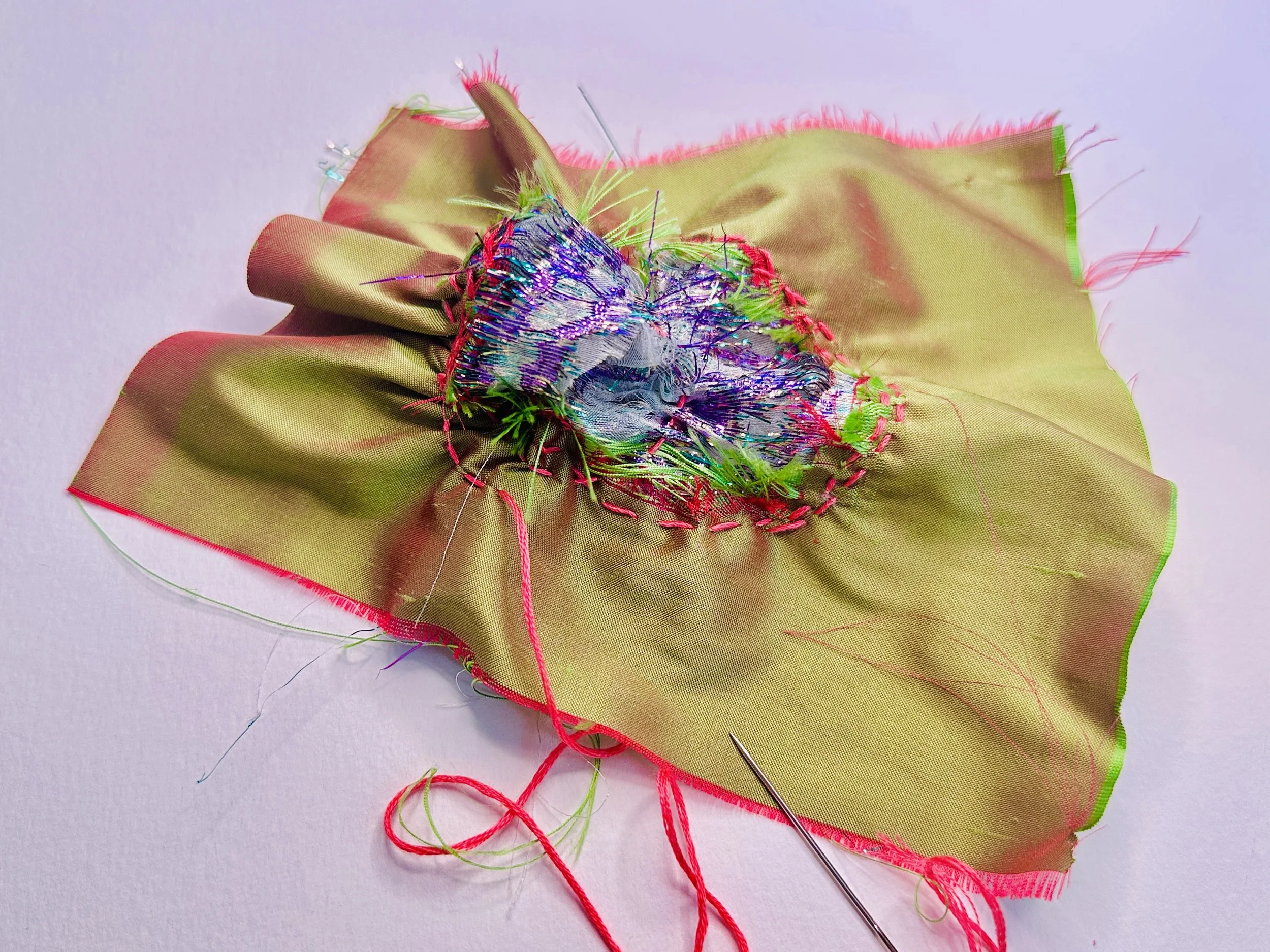 wool yarns, decorative cords, silk taffeta, brocade fabric